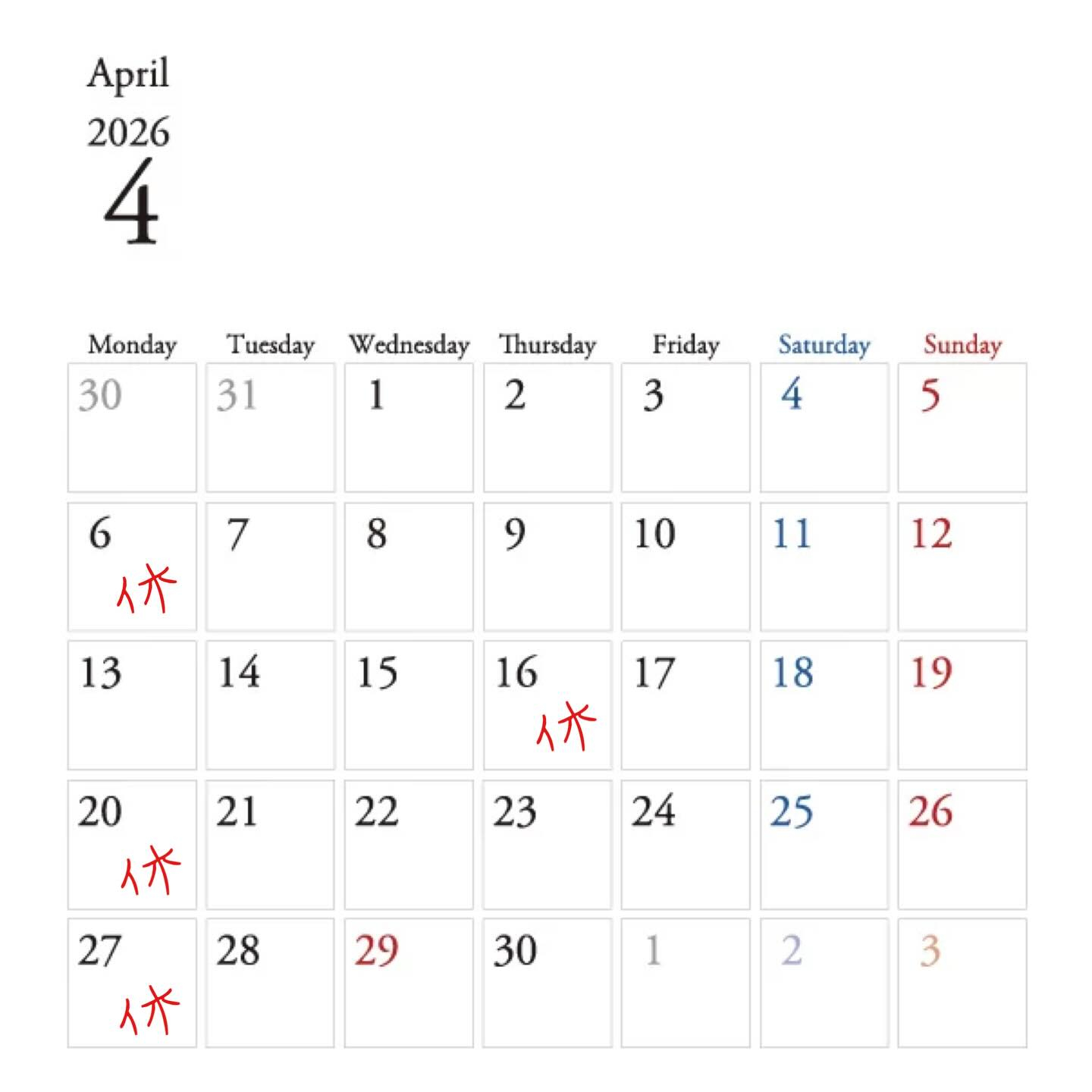 4月のお休みです♀️
