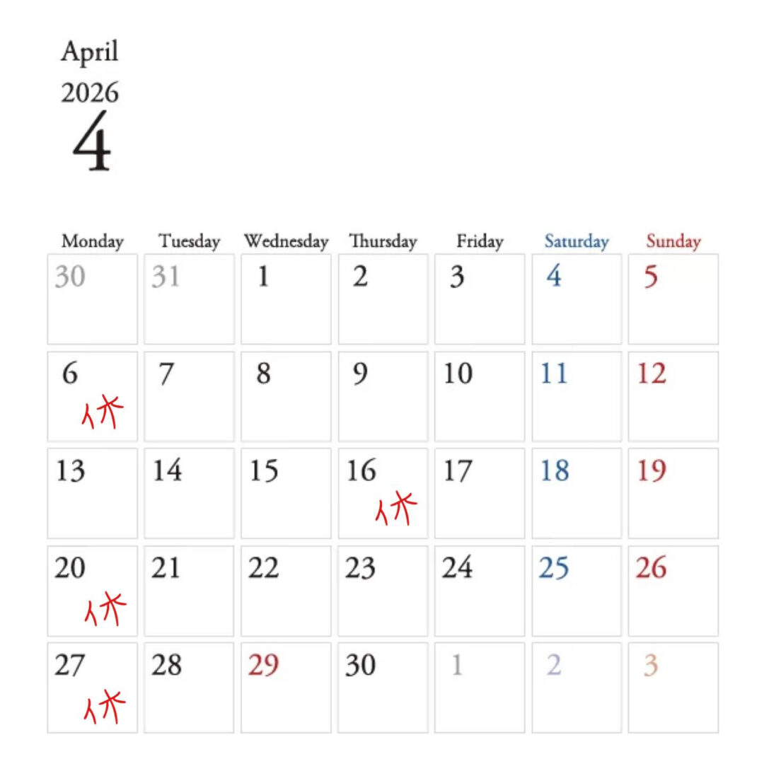 4月のお休みです♀️ 4月のお休みです♀️ エイプリルフールですが、何も面白い嘘が浮かびません。 4月も宜しくお願いします スキル 投稿日 2026年4月1日 ← 3/23(月)居酒屋×音楽 『人参キムチ』 →